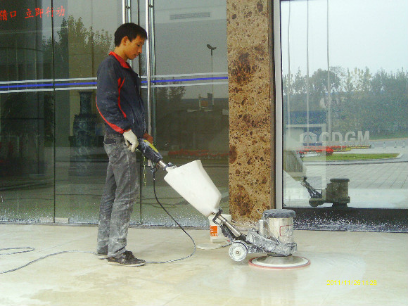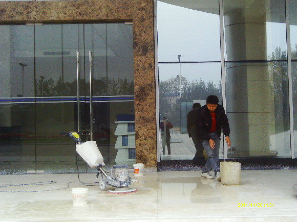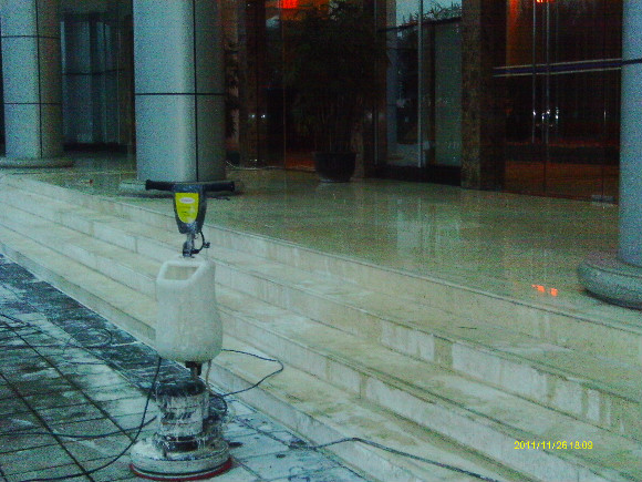 再到80年代末,緣自歐洲程序的一種工藝,“晶面處理系統(tǒng)”于90年代推進(jìn)中國市場。這個系統(tǒng)就是針對水蠟工藝上硬度、光澤、清澈度不夠及工藝復(fù)雜等不足改良而成的,其工藝原理就是在石材投入使用及未受磨損前,以幾種水晶加強劑配合機械,利用石塊籍壓于熱力產(chǎn)生之化學(xué)作用,先將石材表層下的氣孔封閉,使其污垢不能滲入,同時表層上加上幾層熱處理保護(hù)層,起到增加石材表面的硬度和光度,更有防滑之功效,石質(zhì)原有天然色澤得到帶出及全面性保護(hù),保持度教一般水蠟高幾倍。長期使用,耗用的人力物料成本較水蠟低,無須每天補蠟及定期起蠟等復(fù)雜工序,此工藝為目前大理石保養(yǎng)及翻新后晶面的理想工藝,我們稱為石材打蠟第三代。